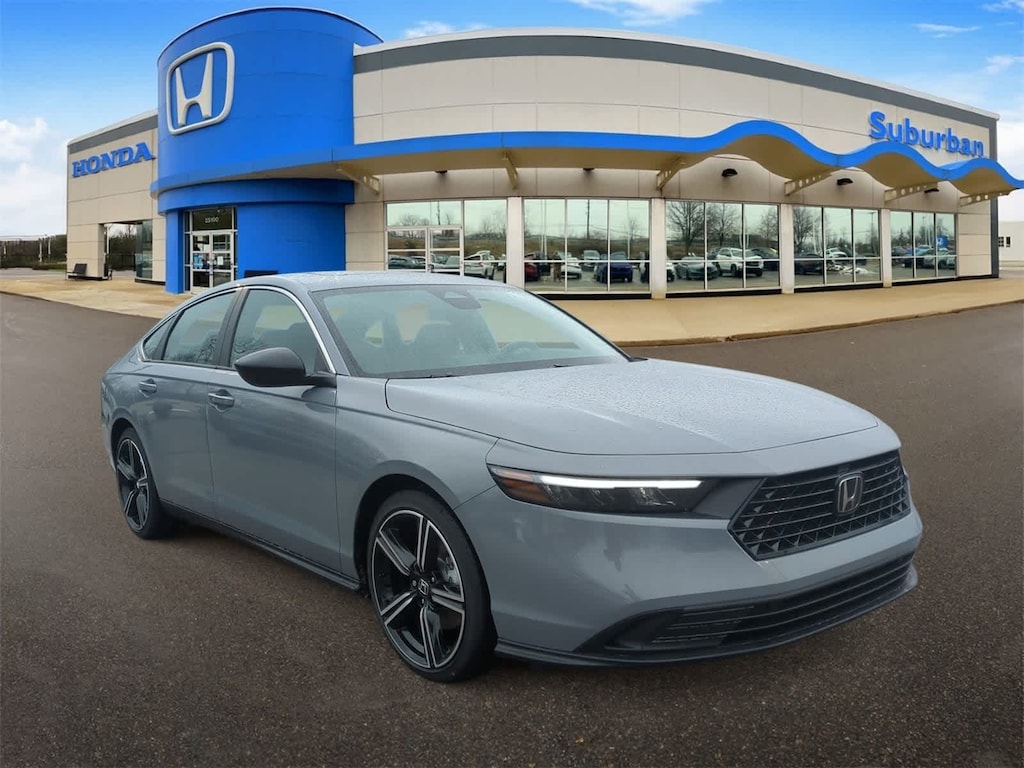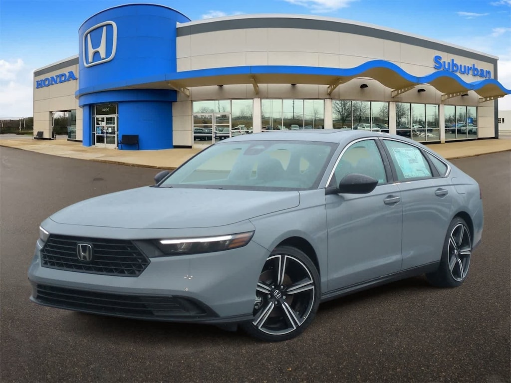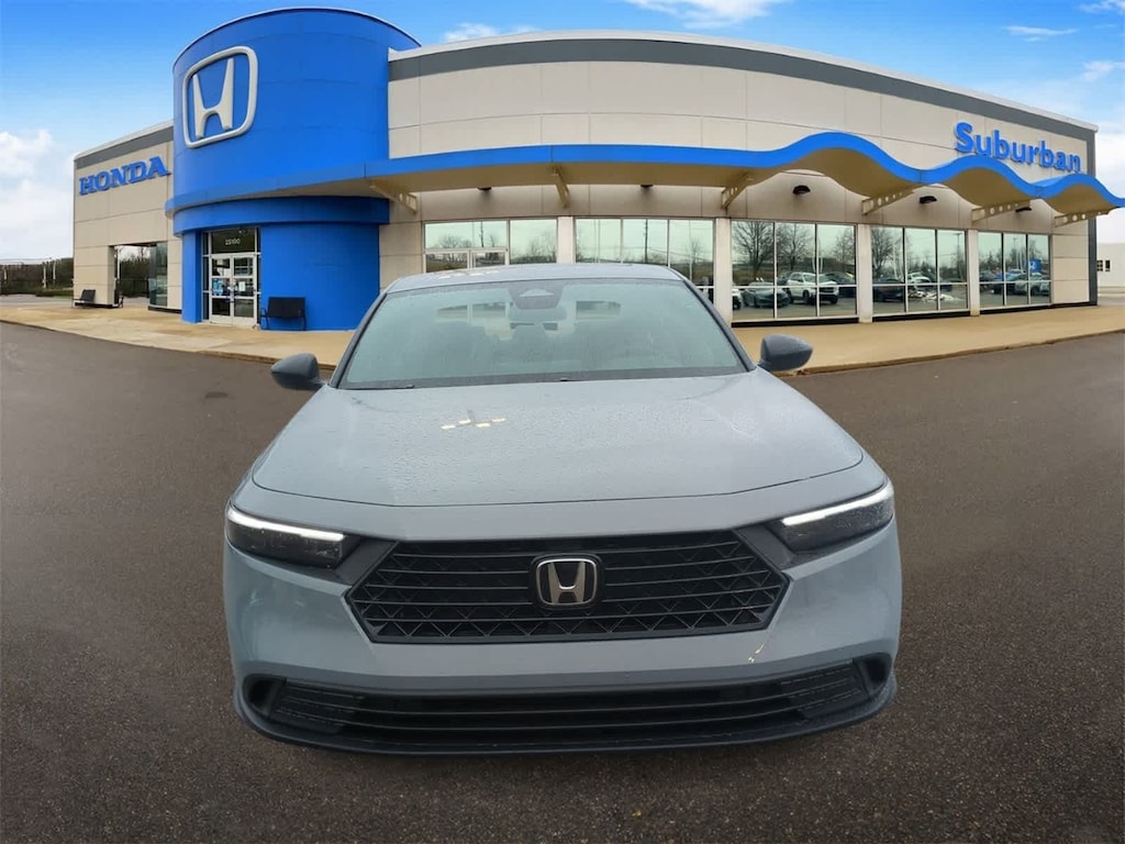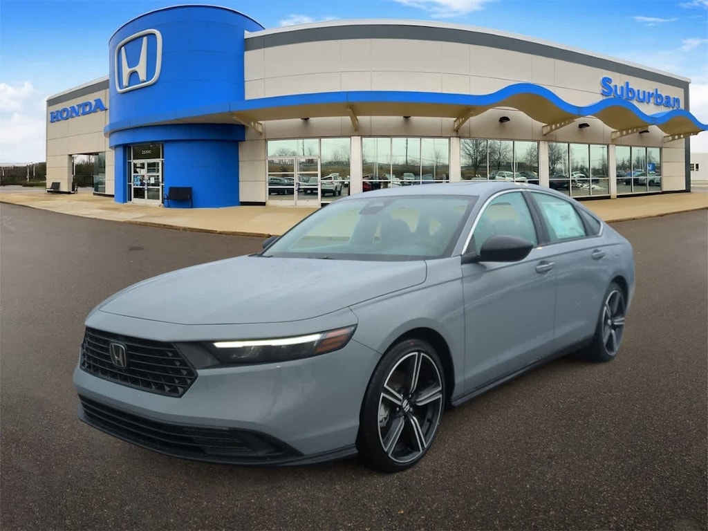 2.0L I4 DOHC 16V, 4-Wheel Disc Brakes, 8 Speakers, ABS brakes, Adaptive Cruise Control: Adaptive Cruise Control (ACC) with Low-Speed Follow, Air Conditioning, Alloy wheels, AM/FM radio, Apple CarPlay/Android Auto, Auto High-beam Headlights, Automatic temperature control, Blind Spot Information (BSI) System warning, Brake assist, Bumpers: body-color, Compass, Delay-off headlights, Driver door bin, Driver vanity mirror, Dual front impact airbags, Dual front side impact airbags, Electronic Stability Control, Emergency communication system: HondaLink, Exterior Parking Camera Rear, Fabric Seat Trim, Four wheel independent suspension, Front anti-roll bar, Front Bucket Seats, Front Center Armrest, Front dual zone A/C, Front reading lights, Fully automatic headlights, Heated Front Bucket Seats, Heated front seats, Illuminated entry, Knee airbag, Lane departure: Lane Keeping Assist System (LKAS) active, Leather Shift Knob, Leather steering wheel, Low tire pressure warning, Occupant sensing airbag, Outside temperature display, Overhead airbag, Overhead console, Panic alarm, Passenger door bin, Passenger vanity mirror, Power door mirrors, Power driver seat, Power moonroof, Power steering, Power windows, Radio data system, Radio: 180-Watt Audio System, Rear anti-roll bar, Rear reading lights, Rear seat center armrest, Rear side impact airbag, Rear window defroster, Remote keyless entry, Security system, Speed control, Speed-sensing steering, Speed-Sensitive Wipers, Split folding rear seat, Spoiler, Steering wheel mounted audio controls, Telescoping steering wheel, Tilt steering wheel, Traction control, Trip computer, Variably intermittent wipers, and Wheels: 19 x 8.5J Berlina Black Bluetooth Backup Camera. Urban Gray Pearl 2025 Honda Accord Hybrid Sport eCVT 2.0L I4 DOHC 16V.