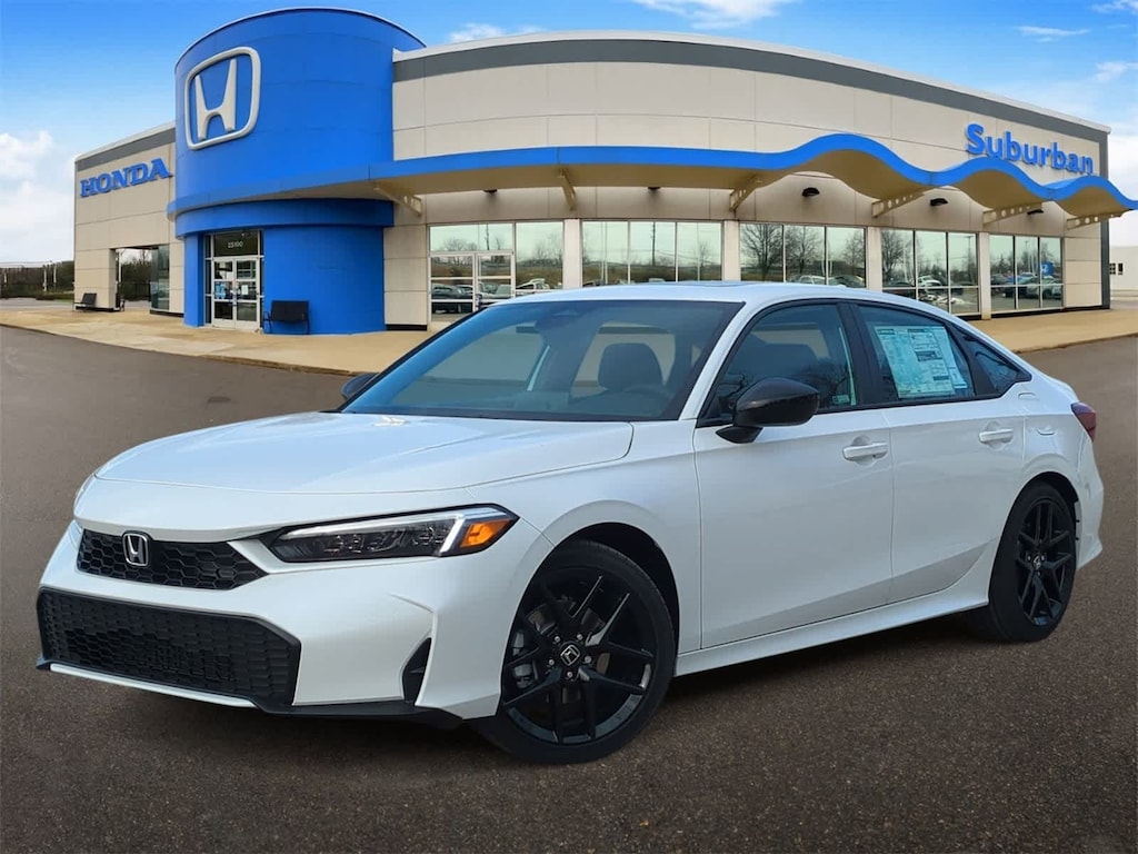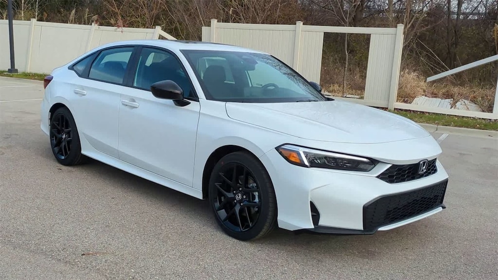 2.0L 16V DOHC, 4-Wheel Disc Brakes, 8 Speakers, ABS brakes, Adaptive Cruise Control: Adaptive Cruise Control (ACC) with Low-Speed Follow, Air Conditioning, Alloy wheels, AM/FM radio, Apple CarPlay/Android Auto, Auto High-beam Headlights, Automatic temperature control, Blind Spot Information (BSI) System warning, Brake assist, Bumpers: body-color, Cloth/Leatherette Seat Trim, Delay-off headlights, Driver door bin, Driver vanity mirror, Dual front impact airbags, Dual front side impact airbags, Electronic Stability Control, Emergency communication system: HondaLink, Exterior Parking Camera Rear, Four wheel independent suspension, Front anti-roll bar, Front Bucket Seats, Front Center Armrest, Front dual zone A/C, Front reading lights, Fully automatic headlights, Heated door mirrors, Heated Front Bucket Seats, Heated front seats, Illuminated entry, Knee airbag, Leather Shift Knob, Leather steering wheel, Low tire pressure warning, Occupant sensing airbag, Outside temperature display, Overhead airbag, Panic alarm, Passenger door bin, Passenger vanity mirror, Power door mirrors, Power moonroof, Power steering, Power windows, Radio data system, Radio: 180-Watt Audio System, Rear anti-roll bar, Rear seat center armrest, Rear side impact airbag, Rear window defroster, Remote keyless entry, Security system, Speed control, Speed-sensing steering, Split folding rear seat, Steering wheel mounted audio controls, Tachometer, Telescoping steering wheel, Tilt steering wheel, Traction control, Trip computer, Variably intermittent wipers, and Wheels: 18 Gloss Black Alloy Bluetooth Backup Camera. Platinum White Pearl 2026 Honda Civic Hybrid Sport eCVT 2.0L 16V DOHC.
