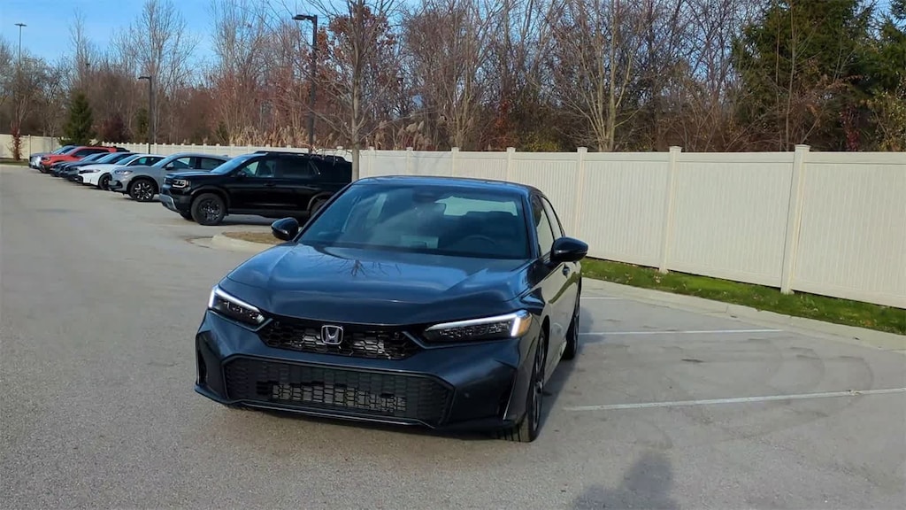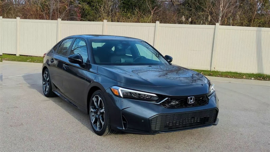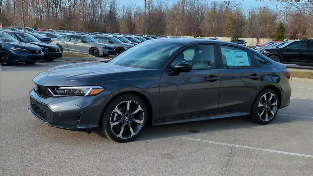 2.0L 16V DOHC, 12 Speakers, 4-Wheel Disc Brakes, ABS brakes, Adaptive Cruise Control: Adaptive Cruise Control (ACC) with Low-Speed Follow, Air Conditioning, Alloy wheels, AM/FM radio, Apple CarPlay/Android Auto, Auto High-beam Headlights, Auto-dimming Rear-View mirror, Automatic temperature control, Blind Spot Information (BSI) System warning, Bose Premium Sound System, Brake assist, Bumpers: body-color, Compass, Delay-off headlights, Driver door bin, Driver vanity mirror, Dual front impact airbags, Dual front side impact airbags, Electronic Stability Control, Emergency communication system: HondaLink, Exterior Parking Camera Rear, Four wheel independent suspension, Front anti-roll bar, Front Bucket Seats, Front Center Armrest, Front dual zone A/C, Front reading lights, Fully automatic headlights, Heated door mirrors, Heated Front Bucket Seats, Heated front seats, Illuminated entry, Knee airbag, Leather Shift Knob, Leather steering wheel, Leather-Trimmed Seat Trim, Low tire pressure warning, Navigation system: Google Maps, Occupant sensing airbag, Outside temperature display, Overhead airbag, Overhead console, Panic alarm, Passenger door bin, Passenger vanity mirror, Power door mirrors, Power driver seat, Power moonroof, Power passenger seat, Power steering, Power windows, Radio data system, Rain sensing wipers, Rear anti-roll bar, Rear seat center armrest, Rear side impact airbag, Rear window defroster, Remote keyless entry, Security system, Speed control, Speed-sensing steering, Split folding rear seat, Steering wheel mounted audio controls, Tachometer, Telescoping steering wheel, Tilt steering wheel, Traction control, Trip computer, Turn signal indicator mirrors, Variably intermittent wipers, and Wheels: 18 Alloy w/Matte Shark Gray Inserts Bluetooth Backup Camera. Meteorite Gray Metallic 2026 Honda Civic Hybrid Sport Touring eCVT 2.0L 16V DOHC.