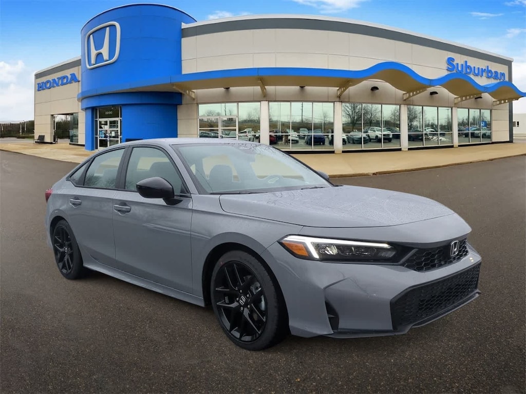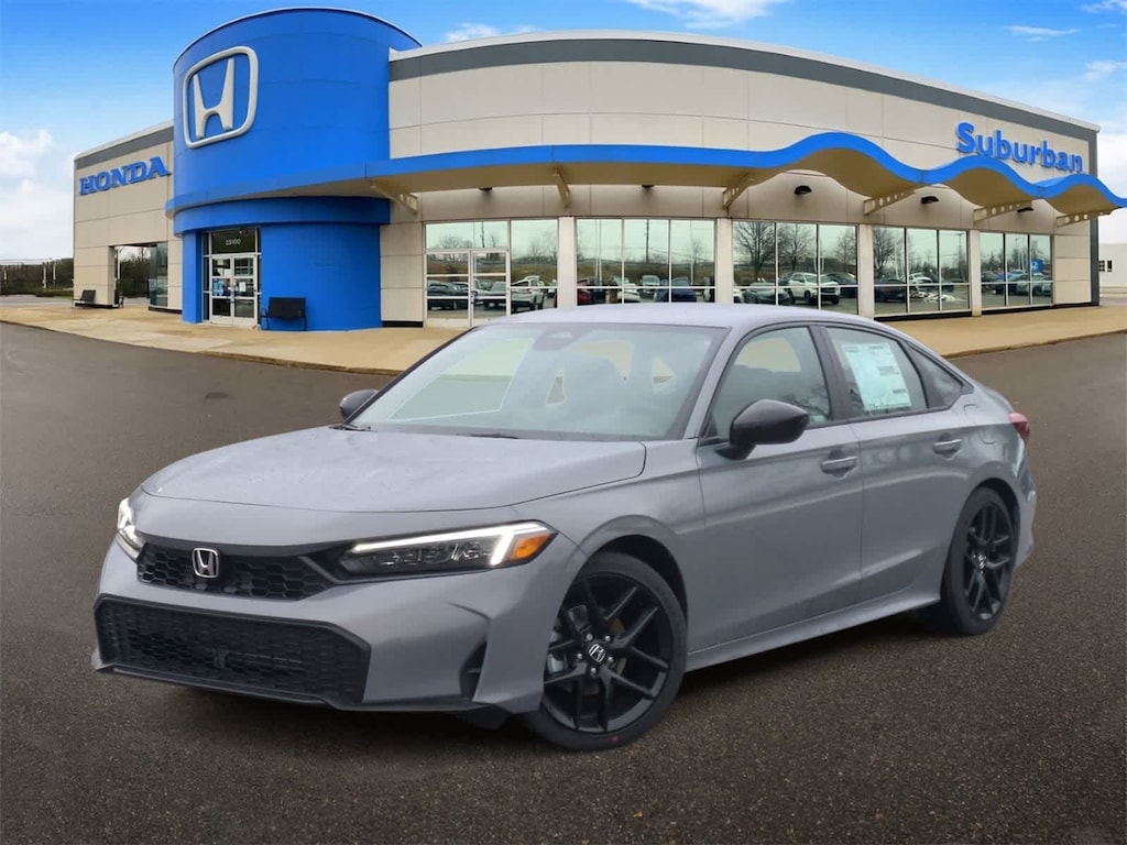 Black Artificial Leather, 4-Wheel Disc Brakes, 8 Speakers, ABS brakes, Adaptive Cruise Control: Adaptive Cruise Control (ACC) with Low-Speed Follow, Air Conditioning, Alloy wheels, AM/FM radio, Apple CarPlay/Android Auto, Auto High-beam Headlights, Automatic temperature control, Blind Spot Information (BSI) System warning, Brake assist, Bumpers: body-color, Cloth/Leatherette Seating Surfaces, Delay-off headlights, Driver door bin, Driver vanity mirror, Dual front impact airbags, Dual front side impact airbags, Electronic Stability Control, Emergency communication system: HondaLink, Exterior Parking Camera Rear, Four wheel independent suspension, Front anti-roll bar, Front Bucket Seats, Front Center Armrest, Front reading lights, Fully automatic headlights, Heated door mirrors, Illuminated entry, Knee airbag, Leather Shift Knob, Leather steering wheel, Low tire pressure warning, Occupant sensing airbag, Outside temperature display, Overhead airbag, Panic alarm, Passenger door bin, Passenger vanity mirror, Power door mirrors, Power steering, Power windows, Radio data system, Radio: 180-Watt Audio System, Rear anti-roll bar, Rear seat center armrest, Rear side impact airbag, Rear window defroster, Remote keyless entry, Security system, Speed control, Speed-sensing steering, Split folding rear seat, Steering wheel mounted audio controls, Tachometer, Telescoping steering wheel, Tilt steering wheel, Traction control, Trip computer, and Wheels: 18 Gloss Black Alloy Bluetooth Backup Camera. Urban Gray Pearl 2026 Honda Civic Sport CVT Black Artificial Leather.