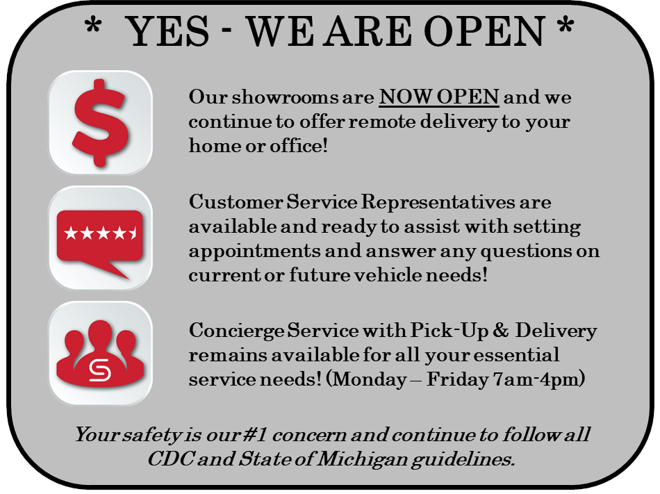 To help streamline your visit, our virtual showrooms are open and our sales teams are available to answer questions, provide pricing information, value your trade-in, and even walk you through the virtual purchasing process, should you prefer we come to you. Your safety is our #1 concern as we continue to follow all CDC and State of Michigan guidelines. Contact us TODAY and let us know how we can service your needs!