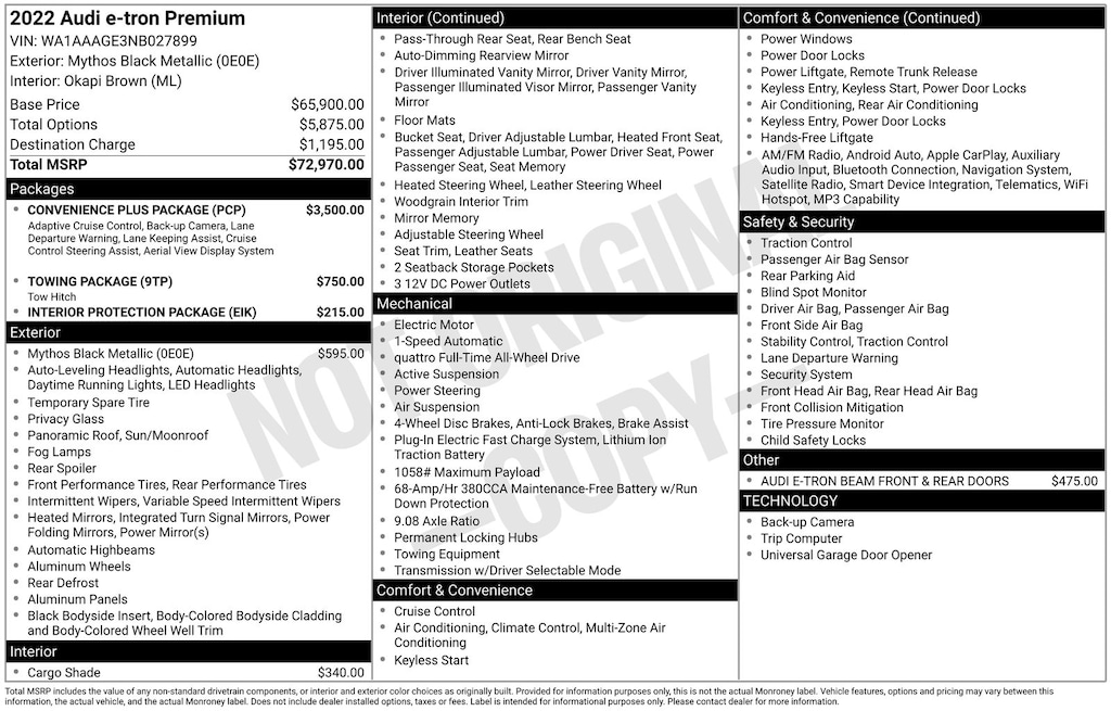 2022 Audi e-tron Premium quattro Is nicely equipped with Black Optic Exterior Package, Convenience Plus Package (Adaptive Cruise Assist w/Lane Guidance and Top View Camera System), 10 Speakers, 4-Wheel Disc Brakes, 9.08 Axle Ratio, ABS brakes, Adaptive suspension, Air Conditioning, Alloy wheels, Audi smartphone interface (Apple CarPlay/Android Auto), Auto High-beam Headlights, Auto-dimming door mirrors, Auto-dimming Rear-View mirror, Auto-leveling suspension, Automatic temperature control, Brake assist, Bumpers: body-color, Compass, Delay-off headlights, Driver door bin, Driver vanity mirror, Dual front impact airbags, Dual front side impact airbags, Electronic Stability Control, Emergency communication system: Audi connect CARE, PRIME & PLUS, Exterior Parking Camera Rear, Four wheel independent suspension, Front anti-roll bar, Front Bucket Seats, Front Center Armrest, Front dual zone A/C, Front fog lights, Front reading lights, Fully automatic headlights, Garage door transmitter: HomeLink, Heated 8-Way Power Front Seats, Heated door mirrors, Heated front seats, Heated steering wheel, Illuminated entry, Leather Seating Surfaces, Low tire pressure warning, Memory seat, Navigation system: Audi MMI Navigation plus with Touch Response, Occupant sensing airbag, Outside temperature display, Overhead airbag, Overhead console, Panic alarm, Passenger door bin, Passenger vanity mirror, Power door mirrors, Power driver seat, Power Liftgate, Power moonroof: Panoramic, Power passenger seat, Power steering, Power windows, Radio data system, Radio: Audi Sound System, Rear air conditioning, Rear anti-roll bar, Rear dual zone A/C, Rear fog lights, Rear reading lights, Rear seat center armrest, Rear window defroster, Rear window wiper, Remote keyless entry, Roof rack: rails only, Security system, Speed control, Speed-sensing steering, Split folding rear seat, Spoiler, Steering wheel memory, Steering wheel mounted audio controls, Telescoping steering wheel, Tilt steering wheel, Traction control, Trip computer, Turn signal indicator mirrors, Variably intermittent wipers, and Wheels: 20" 5-Arm-Dynamic Design Bi-Color Finish.