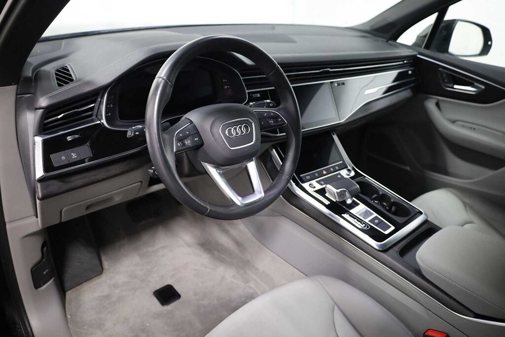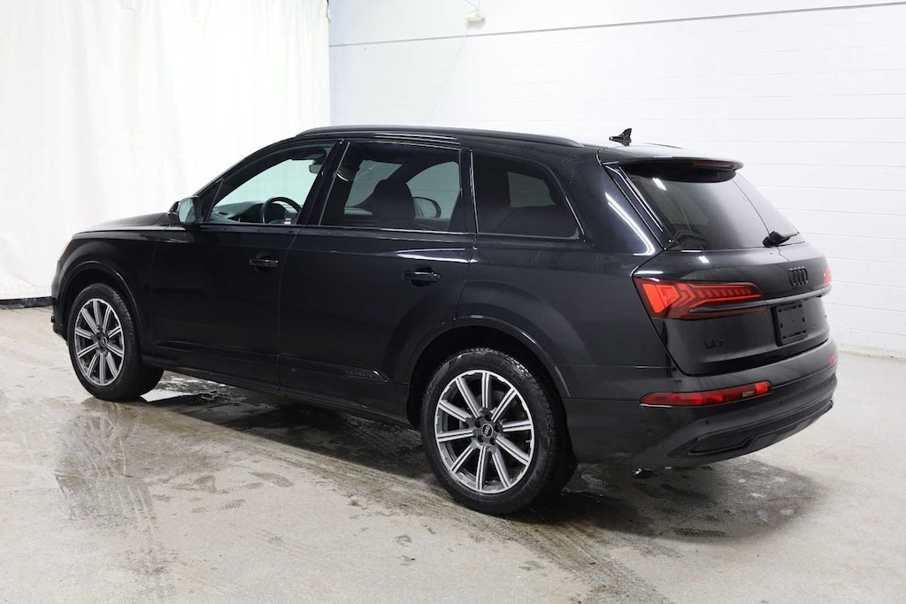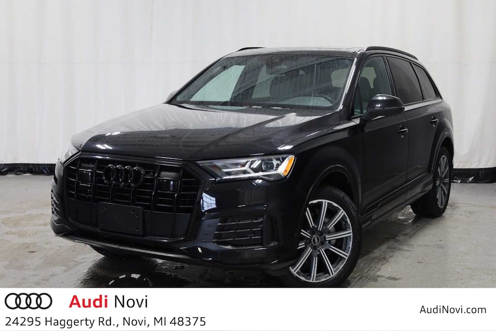 Mythos Black Metallic 2023 Audi Q7 45 Premium Plus quattro quattro 8-Speed Automatic with Tiptronic 2.0L 4-Cylinder TFSI Q7 45 Premium Plus quattro, 4D Sport Utility, 2.0L 4-Cylinder TFSI, quattro, Mythos Black Metallic, Metro Gray w/Leather Seating Surfaces, Adaptive Cruise Assist w/Lane Guidance, Audi Phone Box w/Wireless Charging, Bang & Olufsen Premium Sound System w/3D Sound, Black Optic Package, Convenience Package, Front Bucket Seats, Front Center Armrest, Heated Front Bucket Seats, Heated Steering Wheel, Illuminated Door Sills, Matrix-Design LED Headlights w/DRL Signature, Navigation system: Audi MMI Navigation plus with Touch Response, Power Liftgate, Power moonroof: Panoramic, Premium Plus Package, Topview Camera System, Wheels: 20 10-Spoke-Star Design.
