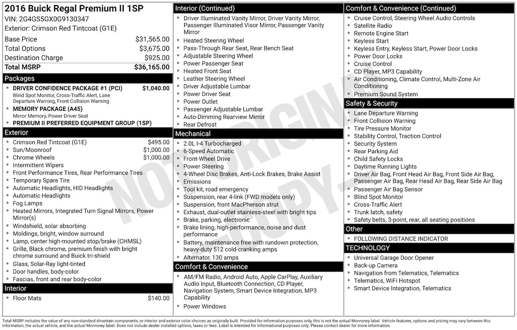 2016 Buick Regal Premium II Is nicely equipped with Driver Confidence Package #1 (Following Distance Indicator, Forward Collision Alert, Lane Departure Warning System, Rear Cross-Traffic Alert, and Side Blind Zone Alert w/Lane Change Alert), Memory Package, Preferred Equipment Group 1SP (Electric Power Steering, Enhanced Driver Instrument Information Display, Front MacPherson Strut Suspension, and Road Emergency Tool Kit), 6-Speed Automatic, 2-Way Adjustable Head Restraints, 2-Way Power Driver Lumbar Seat Adjuster, 4-Wheel Disc Brakes, 8-Way Power Driver Seat Adjuster, 8-Way Power Front Passenger Seat Adjuster, 9 Speakers, ABS brakes, Air Conditioning, All-Weather Floor Mats, Alloy wheels, AM/FM radio: SiriusXM, Auto-dimming Rear-View mirror, Automatic temperature control, Bose Premium 9-Speaker Audio System Feature, Brake assist, Bumpers: body-color, CD player, Compass, Delay-off headlights, Driver door bin, Driver vanity mirror, Dual front impact airbags, Dual front side impact airbags, Electronic Stability Control, Emergency communication system: OnStar Guidance, Exterior Parking Camera Rear, Four wheel independent suspension, Front anti-roll bar, Front Bucket Seats, Front Center Armrest, Front dual zone A/C, Front fog lights, Front Passenger 2-Way Power Lumbar Seat Adjuster, Front reading lights, Fully automatic headlights, Garage door transmitter, Heated door mirrors, Heated Driver & Front Passenger Seats, Heated front seats, Heated steering wheel, High intensity discharge headlights: Bi-Xenon, Illuminated entry, Leather-Appointed Seat Trim, Low tire pressure warning, Navigation System, Occupant sensing airbag, Outside temperature display, Overhead airbag, Overhead console, Panic alarm, Passenger door bin, Passenger vanity mirror, Power door mirrors, Power driver seat, Power passenger seat, Power steering, Power Tilt-Sliding Moonroof w/Sunshade, Power windows, Premium audio system: IntelliLink, Radio data system, Radio: Buick IntelliLink AM/FM Stereo w/Navigation, Rear anti-roll bar, Rear reading lights, Rear seat center armrest, Rear side impact airbag, Rear window defroster, Remote keyless entry, Security system, Single-Slot CD/MP3 Audio System Feature, SiriusXM Satellite Radio, Speed control, Split folding rear seat, Steering wheel mounted audio controls, Tachometer, Telescoping steering wheel, Tilt steering wheel, Traction control, Trip computer, Turn signal indicator mirrors, Variably intermittent wipers, Wheels: 18" Chromed Alloy, and Wheels: 18" Silver Alloy.