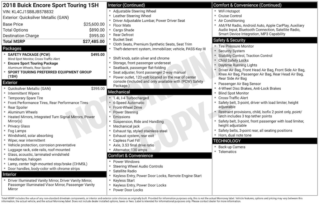 Backup Camera, Leather Seats, 120-Volt Power Outlet, Encore Sport Touring Package, Front Fog Lamps, Preferred Equipment Group 1SH, Rear Cross-Traffic Alert, Rear Sport Spoiler, Remote Vehicle Starter System, Safety Package, Side Blind Zone Alert. 25/33 City/Highway MPG