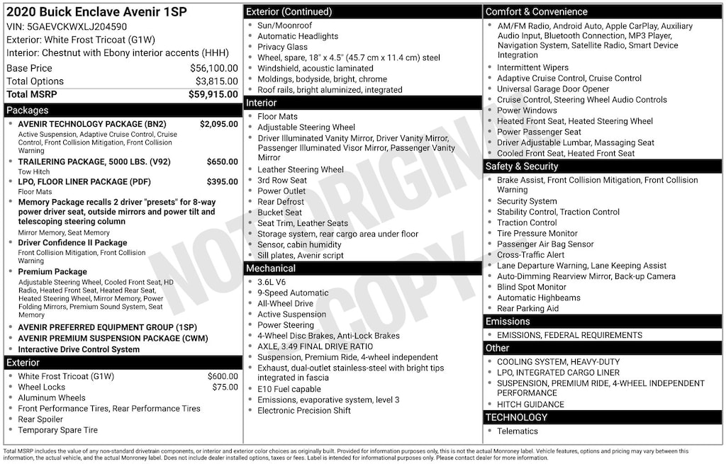 Recent Arrival! Clean CARFAX. 2020 Buick Enclave Avenir Is nicely equipped with 5000lbs Trailering Package (Heavy-Duty Cooling System, Hitch Guidance, and Hitch Guidance w/Hitch View), Avenir Package (120-Volt Power Outlet, 3rd Row 60/40 Power Fold Split-Bench, Automatic Heated Steering Wheel, Front Power Sliding Moonroof, HD Radio, HD Surround Vision, Heated 2nd Row Outboard Seats, Heated Driver & Front Passenger Seats, Inside Rearview Mirror w/Full Camera Display, Outside Heated Power-Adjustable Mirrors, Power Tilt & Telescopic Steering Column, Ventilated Driver & Front Passenger Seats, Wheels & Front Door Badging, and Wireless Charging), Avenir Premium Suspension Package (Chassis Continuously Variable Real Time Damping and Premium Ride Suspension), Avenir Technology Package (Advanced Adaptive Cruise Control and Enhanced Automatic Emergency Braking), Floor Liner Package (LPO) (1st & 2nd Row All-Weather Floor Liners (LPO), 3rd Row All-Weather Floor Liner (LPO), and Integrated Cargo Liner (LPO)), Memory Package, Preferred Equipment Group 1SP, AWD, 10 Speakers, 3.49 Axle Ratio, 3rd row seats: split-bench, 4-Wheel Disc Brakes, 7-Passenger Seating, ABS brakes, Air Conditioning, Alloy wheels, AM/FM radio: SiriusXM with 360L, Apple CarPlay/Android Auto, Audio memory, Auto High-beam Headlights, Auto tilt-away steering wheel, Auto-dimming door mirrors, Auto-dimming Rear-View mirror, Automatic temperature control, Bose Performance-Enhanced 10-Speaker System, Brake assist, Bumpers: body-color, Compass, Delay-off headlights, Driver 4-Way Power Lumbar Seat Adjuster, Driver door bin, Driver vanity mirror, Dual front impact airbags, Dual front side impact airbags, Electronic Stability Control, Emergency communication system: OnStar and Buick connected services capable, Four wheel independent suspension, Front anti-roll bar, Front Bucket Seats, Front Center Armrest, Front dual zone A/C, Front Passenger 4-Way Power Lumbar Seat Adjuster, Front reading lights, Fully automatic headlights, Garage door transmitter, Heated door mirrors, Heated front seats, Heated rear seats, Heated steering wheel, Illuminated entry, Leather steering wheel, Low tire pressure warning, Memory seat, Navigation System, Occupant sensing airbag, Outside temperature display, Overhead airbag, Overhead console, Panic alarm, Passenger door bin, Passenger vanity mirror, Perforated Leather-Appointed Seat Trim, Power door mirrors, Power driver seat, Power Liftgate, Power moonroof, Power passenger seat, Power steering, Power windows, Premium audio system: Buick Infotainment System, Radio data system, Radio: Buick Infotainment Sys AM/FM Stereo w/Nav, Rear air conditioning, Rear anti-roll bar, Rear reading lights, Rear window defroster, Rear window wiper, Remote keyless entry, Roof rack: rails only, Security system, SiriusXM w/360L, Speed control, Speed-sensing steering, Spoiler, Steering wheel memory, Steering wheel mounted audio controls, Tachometer, Telescoping steering wheel, Tilt steering wheel, Traction control, Trip computer, Turn signal indicator mirrors, Variably intermittent wipers, Ventilated front seats, Voltmeter, Wheel Locks, and Wheels: 20" Aluminum w/Premium Pearl Nickel Finish.