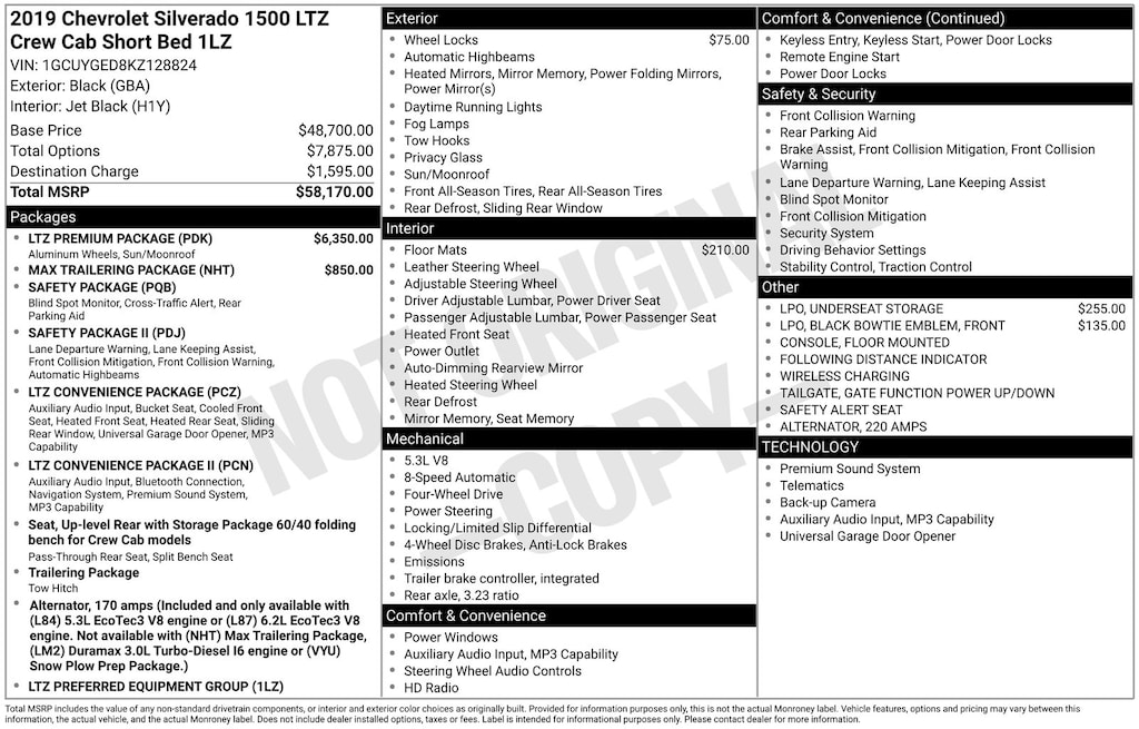 Recent Arrival! Clean CARFAX. 2019 Chevrolet Silverado 1500 LTZ Is nicely equipped with LTZ Convenience Package (2 USB Ports (First Row), 2nd Row Heated Outboard Seats, Floor Mounted Console, Front Bucket Seats, Power Sliding Rear Window w/Rear Defogger, Power Tailgate, Universal Home Remote, and Ventilated Driver & Front Passenger Seats), LTZ Convenience Package II (Premium Bose 7-Speaker Sound System, Radio: Chevrolet Infotainment 3 Premium System, and Wireless Charging), LTZ Premium Package (Power Sunroof), Max Trailering Package (220 Amps Alternator, 3.42 Rear Axle Ratio, Enhanced Cooling Radiator, Heavier Duty Rear Springs, and Increased RGAWR), Preferred Equipment Group 1LZ (10-Way Power Driver Seat w/Lumbar, 10-Way Power Passenger Seat Adjuster w/Lumbar, 12-Volt Rear Auxiliary Power Outlet, 120-Volt Instrument Panel Power Outlet, 170 Amp Alternator, 4.2" Diagonal Color Display Driver Info Center, 6-Speaker Audio System, Advanced Trailering System, Auto-Dimming Inside Rear-View Mirror, Auxiliary External Transmission Oil Cooler, Bluetooth® For Phone, Chrome Grille, Chrome Mirror Caps, Color-Keyed Carpeting Floor Covering, Compass, Deep-Tinted Glass, Driver Memory, Electric Rear-Window Defogger, Electrical Lock Control Steering Column, Electronic Cruise Control, EZ Lift Power Lock & Release Tailgate, Front Frame-Mounted Black Recovery Hooks, Front LED Fog Lamps, Front Rubberized Vinyl Floor Mats, HD Radio, HD Rear Vision Camera, Heated Driver & Front Passenger Seats, Heated Steering Wheel, Heavy-Duty Rear Locking Differential, Hitch Guidance, Hitch Guidance w/Hitch View, Integrated Trailer Brake Controller, Keyless Open & Start, Leather Wrapped Steering Wheel, LED Cargo Area Lighting, Manual Tilt/Telescoping Steering Column, OnStar & Chevrolet Connected Services Capable, Outside Heated Power-Adjustable Mirrors, Power Door Locks, Power Front Passenger Windows w/Express Up/Down, Power Front Windows w/Driver Express Up/Down, Power Rear Windows w/Express Down, Rear Dual USB Charging-Only Ports, Rear Rubberized-Vinyl Floor Mats, Rear Wheelhouse Liners, Remote Vehicle Starter System, SiriusXM Radio, Steering Wheel Audio Controls, Theft Deterrent System (Unauthorized Entry), Trailer Tire Pressure Monitor System, 120-Volt Bed Mounted Power Outlet, Chevrolet Connected Access, and Chevrolet w/4G LTE), Safety Package (Lane Change Alert w/Side Blind Zone Alert, Perimeter Lighting, Rear Cross Traffic Alert, and Ultrasonic Front & Rear Park Assist), Safety Package II (Following Distance Indicator, Forward Collision Alert, Front Pedestrian Braking, IntelliBeam Automatic High Beam On/Off, Lane Keep Assist w/Lane Departure Warning, Low Speed Forward Automatic Braking, and Safety Alert Seat), Trailering Package, Up-Level Rear Seat w/Storage Package, 8-Speed Automatic, 4WD, Jet Black Leather, 4-Wheel Disc Brakes, 40/20/40 Front Split-Bench Seat, 6 Speakers, ABS brakes, Air Conditioning, All-Weather Floor Liner (LPO), Alloy wheels, AM/FM radio: SiriusXM, Apple CarPlay/Android Auto, Auto-dimming door mirrors, Auto-dimming Rear-View mirror, Automatic temperature control, Brake assist, Bumpers: chrome, Delay-off headlights, Driver door bin, Driver vanity mirror, Dual front impact airbags, Dual front side impact airbags, Electronic Stability Control, Front anti-roll bar, Front Black Bowtie Emblem (LPO), Front Center Armrest w/Storage, Front dual zone A/C, Front fog lights, Front reading lights, Front wheel independent suspension, Fully automatic headlights, Heated door mirrors, Heated front seats, Heated steering wheel, Heavy Duty Suspension, Illuminated entry, Low tire pressure warning, Memory seat, Occupant sensing airbag, Outside temperature display, Overhead airbag, Overhead console, Panic alarm, Passenger door bin, Passenger vanity mirror, Perforated Leather Appointed Seat Trim, Power door mirrors, Power driver seat, Power passenger seat, Power steering, Power windows, Premium audio system: Chevrolet Infotainment System 3, Radio data syste