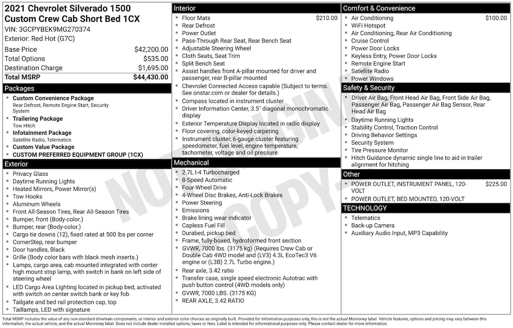 Recent Arrival! Clean CARFAX. 2021 Chevrolet Silverado 1500 Custom Is nicely equipped with Custom Convenience Package (Electric Rear-Window Defogger, EZ Lift Power Lock & Release Tailgate, LED Cargo Area Lighting, Remote Vehicle Starter System, and Theft Deterrent System (Unauthorized Entry)), Custom Value Package, Infotainment Package (4G LTE Wi-Fi Hot Spot Capable, Chevrolet Connected Access Capable, OnStar & Chevrolet Connected Services Capable, and SiriusXM Radio), Preferred Equipment Group 1CX (170 Amp Alternator, 3.5" Diagonal Monochromatic Display, Bluetooth® For Phone, Body Color Grille, Color-Keyed Carpeting Floor Covering, Compass, Deep-Tinted Glass, Electronic Cruise Control, Front Frame-Mounted Black Recovery Hooks, Front Rubberized Vinyl Floor Mats, Manual Tilt Wheel Steering Column, Power Door Locks, Power Front Windows w/Driver Express Up/Down, Power Front Windows w/Passenger Express Down, Power Rear Windows w/Express Down, Rear 60/40 Folding Bench Seat (Folds Up), Rear Rubberized-Vinyl Floor Mats, Remote Keyless Entry, and Standard Tailgate), Trailering Package (Hitch Guidance), 8-Speed Automatic, 4WD, Black Cloth, 120-Volt Bed Mounted Power Outlet, 120-Volt Instrument Panel Power Outlet, 220 Amp Alternator, 3.42 Rear Axle Ratio, 4-Wheel Disc Brakes, 40/20/40 Front Split Bench Seat, 6 Speakers, ABS brakes, Air Conditioning, All-Weather Floor Liner (LPO), Alloy wheels, AM/FM radio: SiriusXM, Apple CarPlay/Android Auto, Automatic Stop/Start, Brake assist, Bumpers: body-color, Cloth Seat Trim, Delay-off headlights, Driver door bin, Driver vanity mirror, Dual front impact airbags, Dual front side impact airbags, Electronic Stability Control, Front anti-roll bar, Front Center Armrest w/Storage, Front reading lights, Front wheel independent suspension, Fully automatic headlights, Heated door mirrors, Heavy Duty Suspension, Illuminated entry, Low tire pressure warning, Occupant sensing airbag, Outside temperature display, Overhead airbag, Overhead console, Panic alarm, Passenger door bin, Passenger vanity mirror, Polished Exhaust Tip, Power door mirrors, Power steering, Power windows, Premium audio system: Chevrolet Infotainment 3, Radio data system, Radio: Chevrolet Infotainment 3 System, Rear reading lights, Rear step bumper, Rear window defroster, Remote keyless entry, Security system, Single-Zone Manual/Semi-Automatic Air Conditioning, Speed control, Speed-sensing steering, Split folding rear seat, Tachometer, Tilt steering wheel, Traction control, Trip computer, Variably intermittent wipers, Voltmeter, and Wheels: 20" x 9" Bright Silver Painted Aluminum.