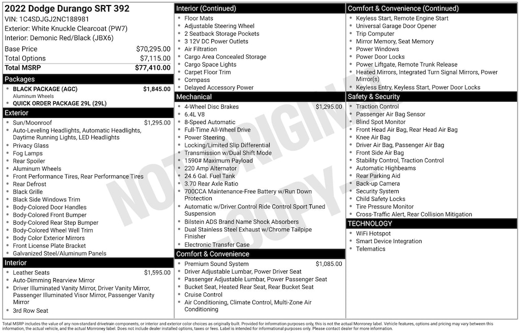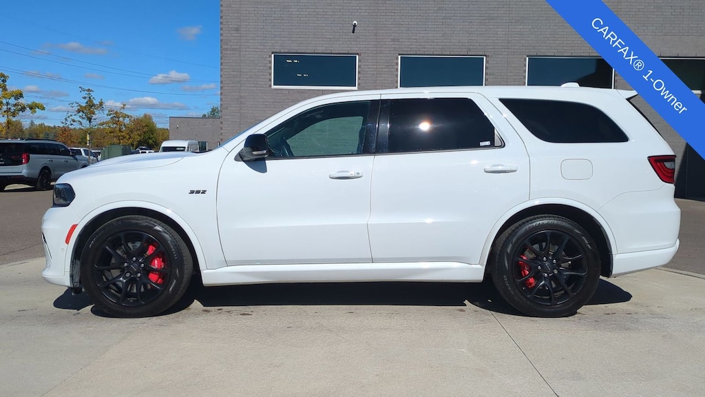 Recent Arrival! 2022 Dodge Durango SRT 392 Is nicely equipped with Black Package (Eclipse Black Exhaust Tip, Gloss Black Exterior Mirrors, Gray Metallic Badges, Satin Black Dodge Tail Lamp Badge, and Wheels: 20" x 10" Lights Out Aluminum), Quick Order Package 29L, AWD, Power Sunroof, 19 harman/kardon Amplified Speakers w/Subwoofer, 2 Pc Front Rotor Red Brembo Brakes, 3.70 Rear Axle Ratio, 3rd row seats: split-bench, 4-Wheel Disc Brakes, 825 Watt Amplifier, 9 Speakers, ABS brakes, Air Conditioning, Alloy wheels, AM/FM radio: SiriusXM w/360L, Anti-whiplash front head restraints, Apple CarPlay/Android Auto, Audio memory, Auto High-beam Headlights, Auto-dimming door mirrors, Auto-dimming Rear-View mirror, Automatic temperature control, Body Color Exterior Mirrors, Brake assist, Bumpers: body-color, Compass, Delay-off headlights, Driver door bin, Driver vanity mirror, Dual front impact airbags, Dual front side impact airbags, Electronic Stability Control, Emergency communication system: SiriusXM Guardian, Four wheel independent suspension, Front anti-roll bar, Front Bucket Seats, Front Center Armrest w/Storage, Front dual zone A/C, Front fog lights, Front reading lights, Fully automatic headlights, Garage door transmitter, Heated door mirrors, Heated front seats, Heated rear seats, Heated steering wheel, Illuminated entry, Knee airbag, Leather Shift Knob, Leather steering wheel, Leather Trimmed Bucket Seats, Low tire pressure warning, Memory seat, Navigation system: TomTom, Occupant sensing airbag, Outside temperature display, Overhead airbag, Overhead console, Panic alarm, ParkView Rear Back-Up Camera, Passenger door bin, Passenger vanity mirror, Power door mirrors, Power driver seat, Power Liftgate, Power passenger seat, Power steering, Power windows, Radio data system, Radio: Uconnect 5 Nav w/10.1" Display, Rain sensing wipers, Rear air conditioning, Rear anti-roll bar, Rear reading lights, Rear window defroster, Rear window wiper, Remote keyless entry, Security system, Speed control, Speed-sensing steering, Speed-Sensitive Wipers, Split folding rear seat, Spoiler, Sport steering wheel, Steering wheel mounted audio controls, Tachometer, Telescoping steering wheel, Tilt steering wheel, Traction control, Trip computer, Turn signal indicator mirrors, Variably intermittent wipers, Ventilated front seats, Voltmeter, and Wheels: 20" x 10" Hyper Black Aluminum.
