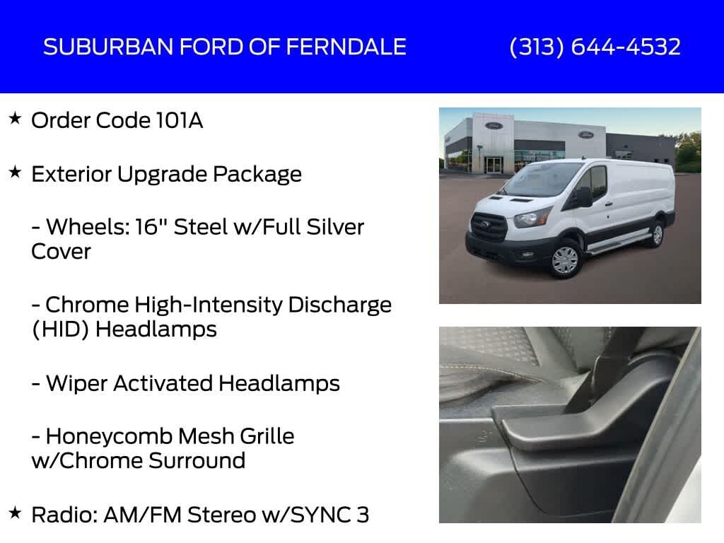 Oxford White 2023 Ford Transit-250 RWD 10-Speed Automatic with Overdrive 3.5L V6 Flex Fuel Chrome High-Intensity Discharge (HID) Headlamps, Cruise Control w/Adjustable Spd Limiting Device (ASLD), Exterior Parking Camera Rear, Exterior Upgrade Package, Fully Automatic Headlights, Honeycomb Mesh Grille w/Chrome Surround, Order Code 101A, Radio: AM/FM Stereo w/SYNC 3, Steering Wheel Mounted Audio Controls, Wheels: 16 Steel w/Full Silver Cover, Wiper Activated Headlamps.