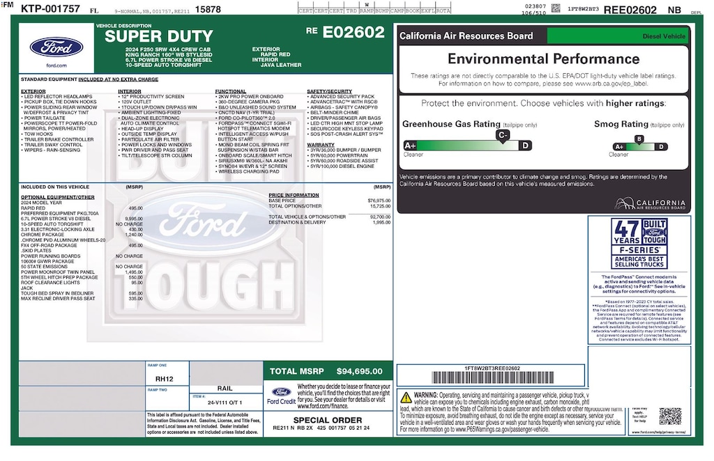 Clean CARFAX. 2024 Ford F-250SD King Ranch Is nicely equipped with 5th Wheel/Gooseneck Hitch Prep Package, Chrome Package (Chrome Door Handles, Chrome Exhaust Tip, Unique Chrome Mirror Caps, and Wheels: 20" Chrome PVD Aluminum), F-250 >10K GVWR Package, FX4 Off-Road Package (Hill Descent Control, Off-Road Specifically Tuned Shock Absorbers, and Unique FX4 Off-Road Box Decal), 4WD, 3.31 Axle Ratio, Twin Panel Power Moonroof, 4-Wheel Disc Brakes, ABS brakes, Adjustable pedals, Air Conditioning, AM/FM radio: SiriusXM with 360L, Auto High-beam Headlights, Auto tilt-away steering wheel, Auto-dimming Rear-View mirror, Automatic temperature control, Brake assist, Compass, Delay-off headlights, Driver door bin, Driver vanity mirror, Dual front impact airbags, Dual front side impact airbags, Electronic Stability Control, Emergency communication system: SYNC 4 911 Assist, Exterior Parking Camera Rear, Flow-Through Console, Front anti-roll bar, Front Bucket Seats, Front Center Armrest, Front dual zone A/C, Front fog lights, Front reading lights, Fully automatic headlights, Garage door transmitter, Heated door mirrors, Heated front seats, Heated rear seats, Heated steering wheel, Illuminated entry, Leather steering wheel, LED Roof Clearance Lights, Low tire pressure warning, Max Recline Seats, Memory seat, Navigation system: Connected Navigation (includes complimentary 1-year trial), Outside temperature display, Overhead airbag, Overhead console, Panic alarm, Passenger door bin, Passenger vanity mirror, Pedal memory, Power door mirrors, Power driver seat, Power passenger seat, Power steering, Power windows, Radio: B&O Unleashed Sound System by Bang & Olufsen, Rain sensing wipers, Rear reading lights, Rear seat center armrest, Rear step bumper, Rear window defroster, Remote keyless entry, Security system, SiriusXM Radio w/360L, Speed control, Split folding rear seat, Steering wheel memory, Steering wheel mounted audio controls, SYNC 4 w/Enhanced Voice Recognition, Tachometer, Telescoping steering wheel, Tilt steering wheel, Tough Bed Spray-In Bedliner, Traction control, Trip computer, Turn signal indicator mirrors, Variably intermittent wipers, and Ventilated front seats.