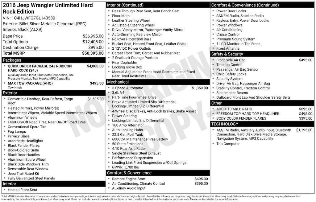 Recent Arrival! Clean CARFAX. 2016 Jeep Wrangler Unlimited Rubicon Is nicely equipped with Connectivity Group (Leather Wrapped Steering Wheel, Remote USB Port, Tire Pressure Monitoring Display, Uconnect Voice Command w/Bluetooth, and Vehicle Information Center), Max Tow Package (Class II Receiver Hitch and Trailer Tow w/4-Pin Connector Wiring), Quick Order Package 23J Rubicon Hard Rock (Accent Stitching, Alpine 9-Speaker w/All Weather Subwoofer, Black/Chrome Screws Fuel Filler Door, Chrome/Leather Wrapped Shift Knob, Hood w/Power Dome, Jeep Trail Rated Kit, Leather Trimmed Bucket Seats, Low Gloss Black Wrangler Decal, MOPAR Slush Mats, Premium Black Sunrider Soft Top, Premium EVIC Message Center, Red Front & Rear Tow Hooks, Red Trail Rated Badge, Rubicon Hood Decal, Silver Interior Accents, Steel Front Bumper, Steel Rear Bumper, Wheels: 17" x 7.5" Polished Semi-Gloss Black, Driver Height Adjuster Seat, Front Seat Back Map Pockets, and Heated Front Seats), Quick Order Package 24J Rubicon Hard Rock, Rubicon Hard Rock Package, 40GB Hard Drive w/28GB Available, 5-Year SiriusXM Travel Link Service, 6.5" Touchscreen Display, Audio Jack Input for Mobile Devices, Body Color 3-Piece Hard Top, Freedom Panel Storage Bag, GPS Navigation, Radio: 430N, Rear Window Defroster, Rear Window Wiper/Washer, SiriusXM Travel Link, 17" x 7.5" Polished Mineral Gray Wheels, 4-Wheel Disc Brakes, 4.10 Rear Axle Ratio, 8 Speakers, ABS brakes, Add 4.10 Axle Ratio, Air Conditioning, Air Conditioning w/Auto Temperature Control, Air Filtering, Alloy wheels, AM/FM radio: SiriusXM, Auto-dimming Rear-View mirror, Body Color Fender Flares, Brake assist, CD player, Cloth Seats w/Adjustable Head Restraints, Compass, Driver door bin, Driver vanity mirror, Dual front impact airbags, Electronic Stability Control, Freedom Top Hard Top Headliner, Front anti-roll bar, Front Bucket Seats, Front Center Armrest w/Storage, Front fog lights, Front reading lights, Fully automatic headlights, Heated door mirrors, Humidity Sensor, Illuminated entry, Integrated roll-over protection, Leather steering wheel, Low tire pressure warning, Occupant sensing airbag, Outside temperature display, Panic alarm, Passenger door bin, Passenger vanity mirror, Performance Suspension, Power door mirrors, Power steering, Power windows, Radio data system, Radio: 130, Rear anti-roll bar, Remote keyless entry, Remote Start System, Security system, Speed control, Split folding rear seat, Steering wheel mounted audio controls, Supplemental Front Seat Side Airbags, Tachometer, Tilt steering wheel, Traction control, Trip computer, and Variably intermittent wipers.