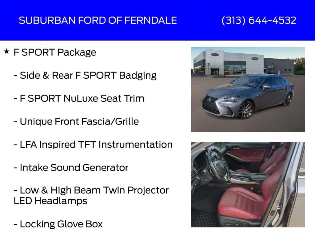 Nebula Gray Pearl 2019 Lexus IS 300 AWD 6-Speed Automatic 3.5L V6 DOHC Dual VVT-i 24V AWD, Black w/F SPORT NuLuxe Seat Trim, Aluminum Sport Pedals, AM/FM Radio: SiriusXM, Automatic Temperature Control, Black Headliner, Exterior Parking Camera Rear, F SPORT NuLuxe Seat Trim, F SPORT Package, F SPORT Tuned Suspension, Front Dual Zone A/C, Fully Automatic Headlights, Heated & Ventilated Front F SPORT Seats, Heated External Mirrors, Heated Front Seats, Intake Sound Generator, Lexus Enform App Suite (Subscription Free), Lexus Enform Destinations, Lexus Insider, LFA Inspired TFT Instrumentation, Locking Glove Box, Low & High Beam Twin Projector LED Headlamps, Navigation Package, Power Driver Seat, Power Moonroof, Radio: Lexus Display Audio w/Navigation System, Rear Window Defroster, Remote Keyless Entry, Side & Rear F SPORT Badging, Silver Performance Trim, Stainless Steel Scuff Plates, Unique Front Fascia/Grille, Unique Rear Bumper, Wheels: 18 F SPORT Split 5-Spoke Alloy.
