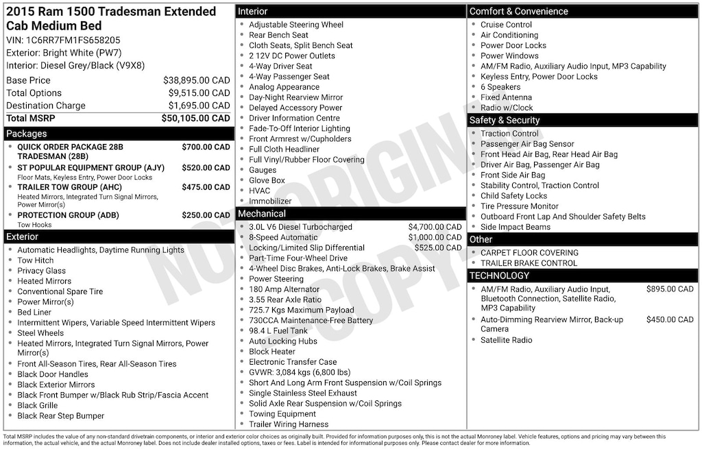 Recent Arrival! 2015 Ram 1500 Tradesman Is nicely equipped with Popular Equipment Group (Cloth 40/20/40 Bench Seat, Remote Keyless Entry w/All-Secure, SIRIUSXM Satellite Radio, 1-Year SiriusXM Radio Service, 40/20/40 Split Bench Seat, For More Info, Call 800-643-2112, Front Armrest w/Three Cupholders, No Satellite Coverage w/AK/HI, and Rear Folding Seat), Protection Group (Tow Hooks), Quick Order Package 28B Tradesman, Tradesman Package, Trailer Tow Mirrors & Brake Group (Power Black Trailer Tow Mirrors, Trailer Brake Control, Black Exterior Mirrors, Exterior Mirrors Courtesy Lamps, Exterior Mirrors w/Heating Element, Exterior Mirrors w/Supplemental Signals, and Trailer Tow Mirrors), 17" x 7" Steel Wheels, 4-Wheel Disc Brakes, 5.0" Touchscreen Display, 6 Speakers, ABS brakes, Active Grille Shutters, Air Conditioning, AM/FM radio, Anti-Spin Differential Rear Axle, Brake assist, Carpet Floor Covering, Center Hub, Charge Only Remote USB Port, Delay-off headlights, Driver door bin, Dual front impact airbags, Dual front side impact airbags, Electronic Shift, Electronic Stability Control, Front anti-roll bar, Front Center Armrest, Front wheel independent suspension, Fully automatic headlights, GPS Antenna Input, Heated door mirrors, Heavy Duty Vinyl 40/20/40 Split Bench Seat, Integrated Voice Command w/Bluetooth, Low tire pressure warning, Media Hub (USB, AUX), Occupant sensing airbag, Overhead airbag, Overhead Console, ParkView Rear Back-Up Camera, Passenger door bin, Power door mirrors, Power steering, Power windows, Radio data system, Radio: Uconnect 3.0 AM/FM, Radio: Uconnect 5.0 AM/FM/BT, Rear anti-roll bar, Rear step bumper, Rear View Auto Dim Mirror w/Display, Rear View Mirror w/Microphone, Speed control, Tachometer, Temperature & Compass Gauge, Tilt steering wheel, Tip Start, Traction control, Variably intermittent wipers, and Voltmeter.