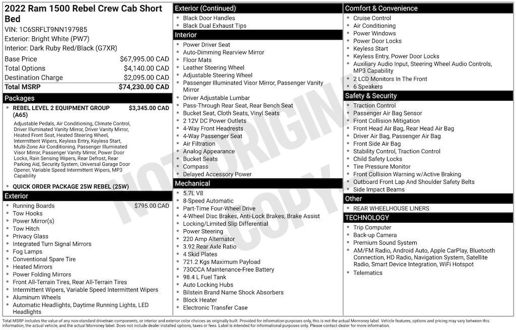 Recent Arrival! Clean CARFAX. 2022 Ram 1500 Rebel Is nicely equipped with Quick Order Package 25W Rebel, Rebel Level 2 Equipment Group (115V Auxiliary Rear Power Outlet, 2-Door Passive Entry, Front Door Locks, 2nd Row In Floor Storage Bins, 4G LTE Wi-Fi Hot Spot, 8.4" Touchscreen Display, Air Conditioning ATC w/Dual Zone Control, Apple CarPlay, Auto-Dimming Exterior Driver Mirror, Black Exterior Mirrors, Black Premium Power Mirrors, Bluetooth Handsfree Phone & Audio, Body Color Door Handles, Connectivity - US/Canada, Convex Wide-Angle Mirror Insert, Exterior Mirrors Courtesy Lamps, Exterior Mirrors w/Heating Element, Exterior Mirrors w/Supplemental Signals, Foam Bottle Insert (Door Trim Panel), For Details, Visit DriveUconnect.com, Global Telematics Box Module (TBM), Google Android Auto, GPS Antenna Input, Heated Front Seats, Heated Steering Wheel, Integrated Center Stack Radio, Media Hub w/2 Charge Only USBs, ParkSense Front/Rear Park Assist w/Stop, Power Adjustable Pedals, Power-Folding Mirrors, Radio: Uconnect 5 W w/8.4" Display, Rain Sensitive Windshield Wipers, Rear Dome w/On/Off Switch Lamp, Rear Window Defroster, Remote Start System, Security Alarm, SiriusXM Radio Service, SiriusXM Satellite Radio, Sun Visors w/Illuminated Vanity Mirrors, Universal Garage Door Opener, and USB Host Flip), 3.92 Rear Axle Ratio, 4 Way Front Headrests, 4-Wheel Disc Brakes, 48V Belt Starter Generator, 6 Speakers, 9 Amplified Speakers w/Subwoofer, ABS brakes, Air Conditioning, Alloy wheels, AM/FM radio: SiriusXM, Auto-dimming Rear-View mirror, Brake assist, Bucket Seats, Cloth/Vinyl Low Back Bucket Seats, Compass, Delay-off headlights, Driver door bin, Dual front impact airbags, Dual front side impact airbags, Electronic Stability Control, Emergency communication system: SiriusXM Guardian, Front anti-roll bar, Front Bucket Seats, Front Center Armrest w/Storage, Front fog lights, Front reading lights, Front Seat Back Map Pockets, Front wheel independent suspension, Full Length Upgraded Floor Console, Fully automatic headlights, Heated door mirrors, Illuminated entry, Integrated Voice Command w/Bluetooth, Leather steering wheel, Low tire pressure warning, Mopar Black Tubular Side Steps, Occupant sensing airbag, Outside temperature display, Overhead airbag, Overhead console, Panic alarm, ParkView Rear Back-Up Camera, Passenger door bin, Passenger vanity mirror, Power 2-Way Driver Lumbar Adjust, Power door mirrors, Power driver seat, Power steering, Power windows, Radio data system, Radio: Uconnect 3 w/5" Display, Rear 60/40 Folding Seat, Rear anti-roll bar, Rear seat center armrest, Rear step bumper, Rear Wheelhouse Liners, Remote keyless entry, Speed control, Split folding rear seat, Steering wheel mounted audio controls, Tachometer, Telescoping steering wheel, Tilt steering wheel, Traction control, Trip computer, Twill Film Appliques, Variably intermittent wipers, Voltmeter, and Wheels: 18" x 8.0" Painted Mid-Gloss BlacK.