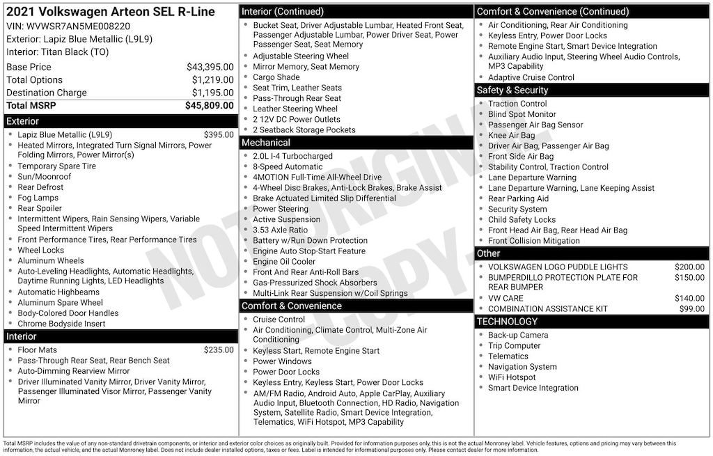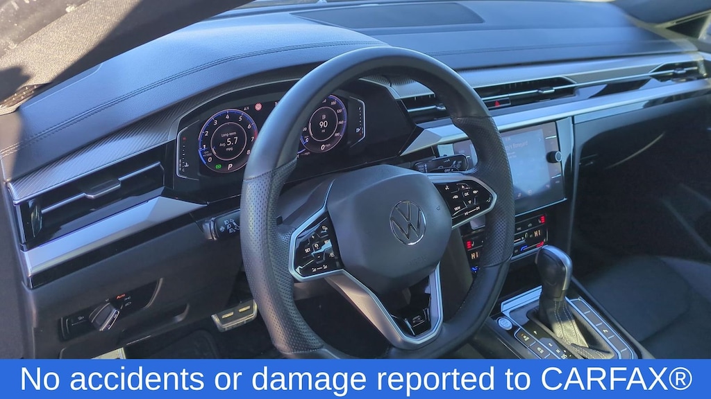 Clean CARFAX. Certified. 2021 Volkswagen Arteon 2.0T SEL R-Line Is nicely equipped with Ford Blue Advantage: Blue Certified Certified, Navigation System, 4-Wheel Disc Brakes, 8 Speakers, ABS brakes, Adaptive suspension, Air Conditioning, Alloy wheels, AM/FM radio: SiriusXM with 360L, Auto High-beam Headlights, Auto-dimming door mirrors, Auto-dimming Rear-View mirror, Automatic temperature control, Brake assist, Bumpers: body-color, Compass, Delay-off headlights, Driver door bin, Driver vanity mirror, Dual front impact airbags, Dual front side impact airbags, Electronic Stability Control, Emergency communication system: VW Car-Net Safe & Secure 5-year, Exterior Parking Camera Rear, Four wheel independent suspension, Front anti-roll bar, Front Bucket Seats, Front Center Armrest, Front dual zone A/C, Front fog lights, Front reading lights, Fully automatic headlights, Heated door mirrors, Heated Front Comfort Sport Seats, Heated front seats, Illuminated entry, Knee airbag, Leather Shift Knob, Leather steering wheel, Low tire pressure warning, Memory seat, Occupant sensing airbag, Outside temperature display, Overhead airbag, Overhead console, Panic alarm, Passenger door bin, Passenger vanity mirror, Perforated Nappa Leather Seating Surfaces, Power door mirrors, Power driver seat, Power moonroof, Power passenger seat, Power steering, Power windows, Radio data system, Radio: MIB3 Discover Media Navigation AM/FM/HD, Rain sensing wipers, Rear air conditioning, Rear anti-roll bar, Rear reading lights, Rear seat center armrest, Rear window defroster, Remote keyless entry, Security system, Speed control, Speed-sensing steering, Split folding rear seat, Spoiler, Sport steering wheel, Steering wheel mounted audio controls, Tachometer, Telescoping steering wheel, Tilt steering wheel, Traction control, Trip computer, Turn signal indicator mirrors, Variably intermittent wipers, and Wheels: 19" 2-Tone Machined Alloy.